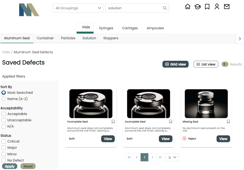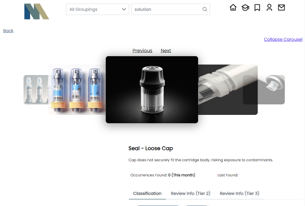 MVI features a Learning Center with interactive quiz training modes. Inspectors can enhance their skills by categorizing and grouping defects from the library, providing ongoing training based on existing data.